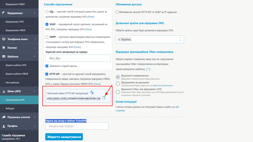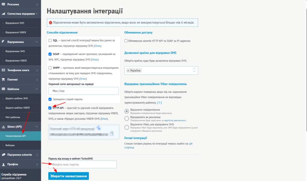 Коли відправника буде додано на сторінці Налаштування API потрібно активувати галочку HTTP API, ввести Пароль від входу в кабінет TurboSMS і зберегти