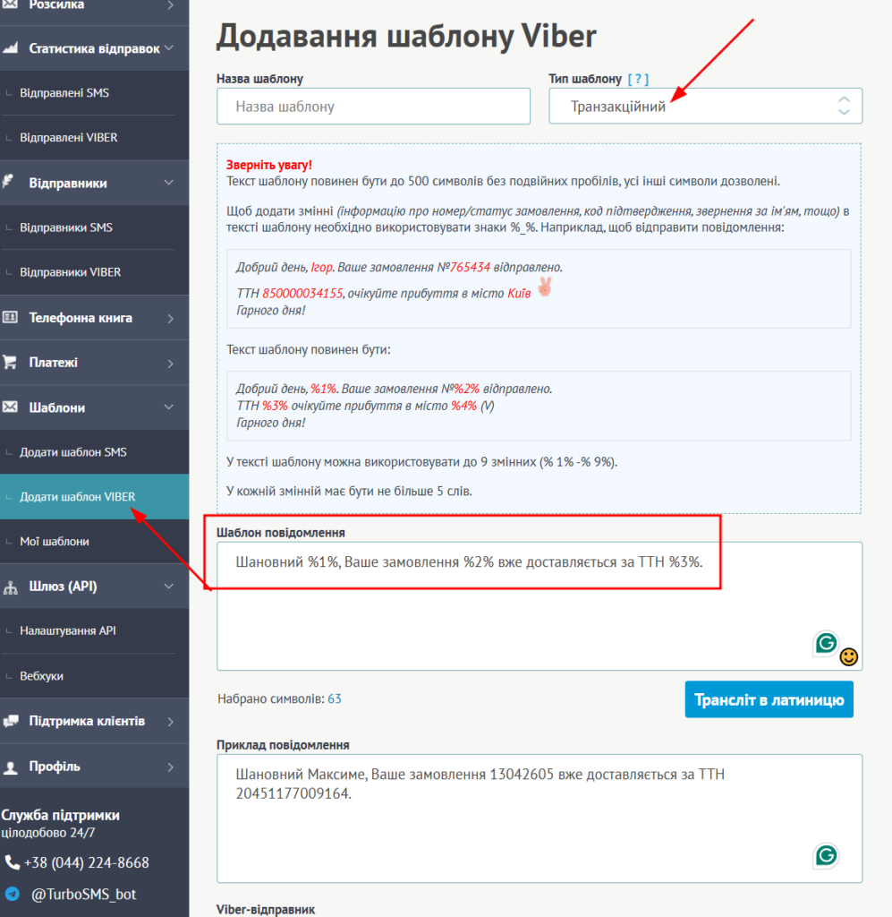 Після підписання угоди TurboSms зможе додати відправника до Вашого кабінету. Далі потрібно буде зареєструвати шаблони транзакційних повідомлень у розділі «Шаблони».