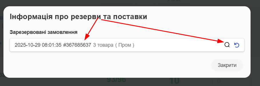 Здесь этот резерв можно снять или через кнопку перхоти направиться в раздел где есть этот заказ.