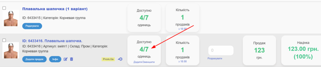 Если именно в этот момент вы измените количество на складе (например, у вас окажется в наличии не 5 единиц на складе, а 6 единиц), нажав кнопку «Добавить\Списать» и укажете 6, вместо 5, то у вас значение остатков изменится на 4/6, и на Пром уже передастся цифра 4, потому что 2 штуки все равно в резерве.