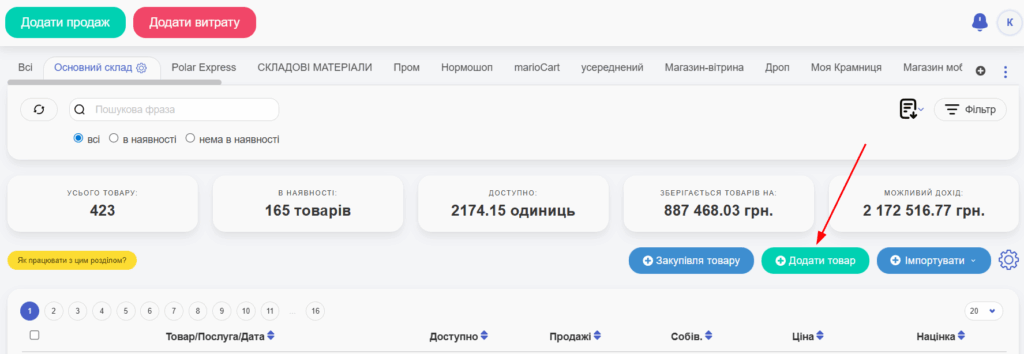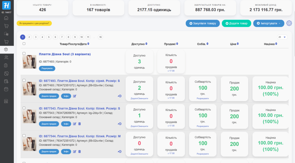 В результаті у розділі “Товари” у вас з’явиться таблиця з конкретною моделлю товару і всіма даними про неї (Скрін 9). Під самим товаром є три активні кнопки: “Додати продаж”, “Інфо” і “Видалити” “Редагувати”.