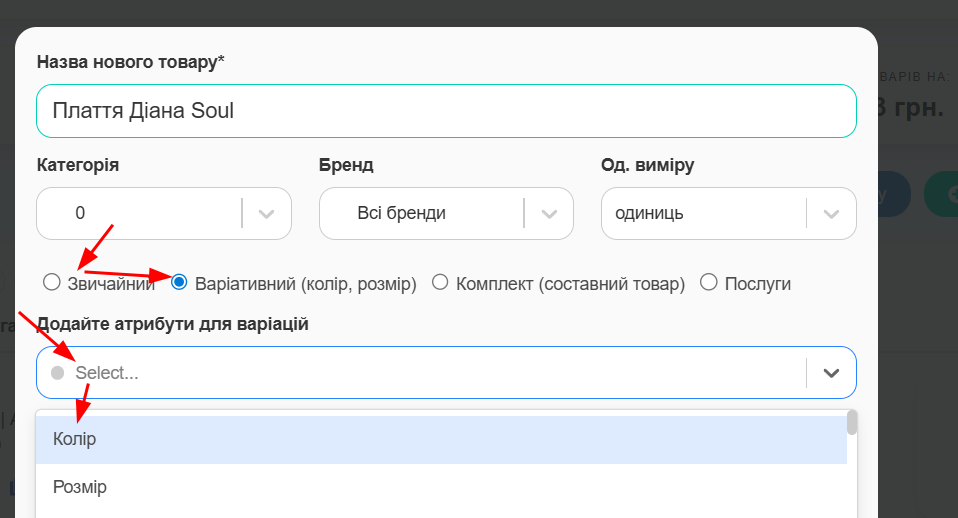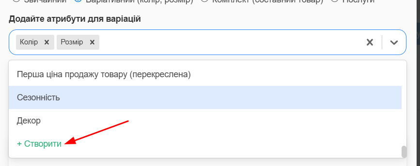Атрибути обов’язкове для заповнення поле. Система сформує назву цього товару як назва на попередньому кроці плюс ці значення атрибутів які задасте тут.