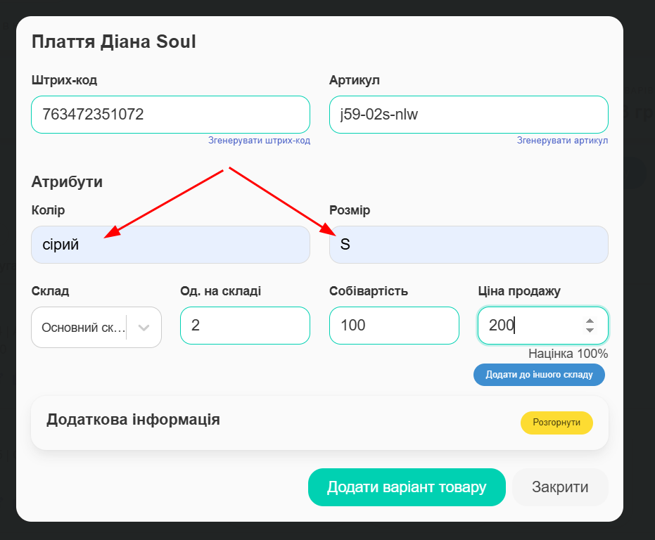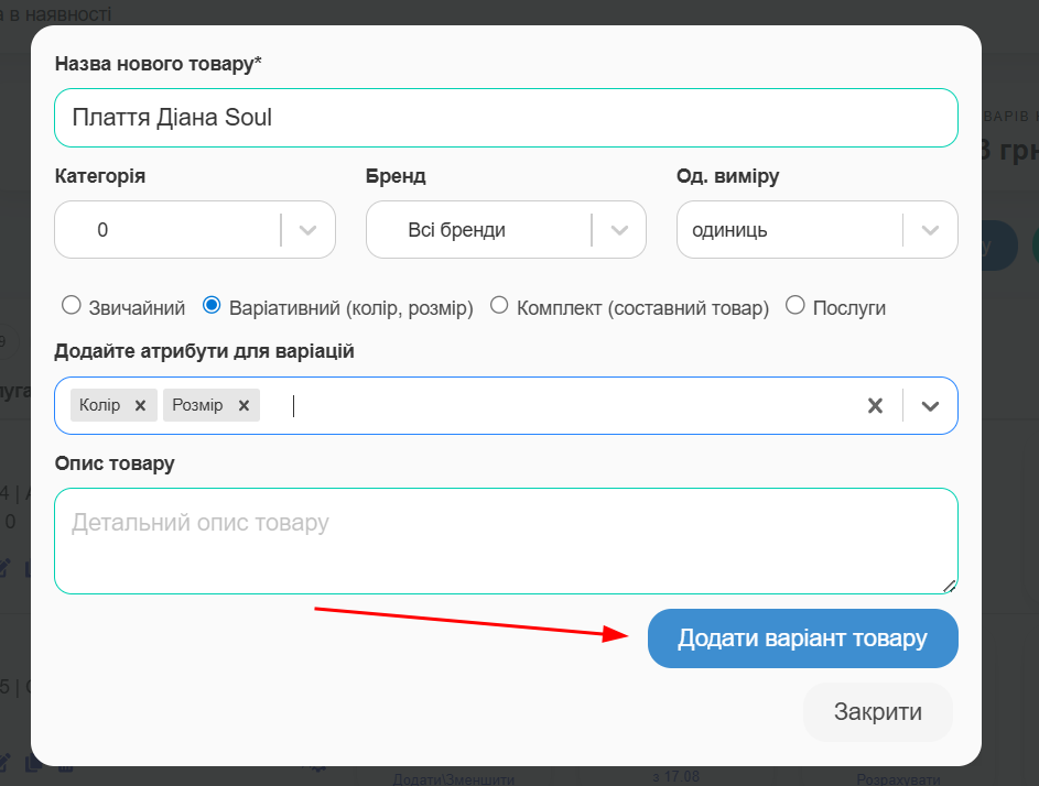 У відкритому вікні необхідно заповнити всі потрібні вам поля і натиснути “Додати варіант товару “.