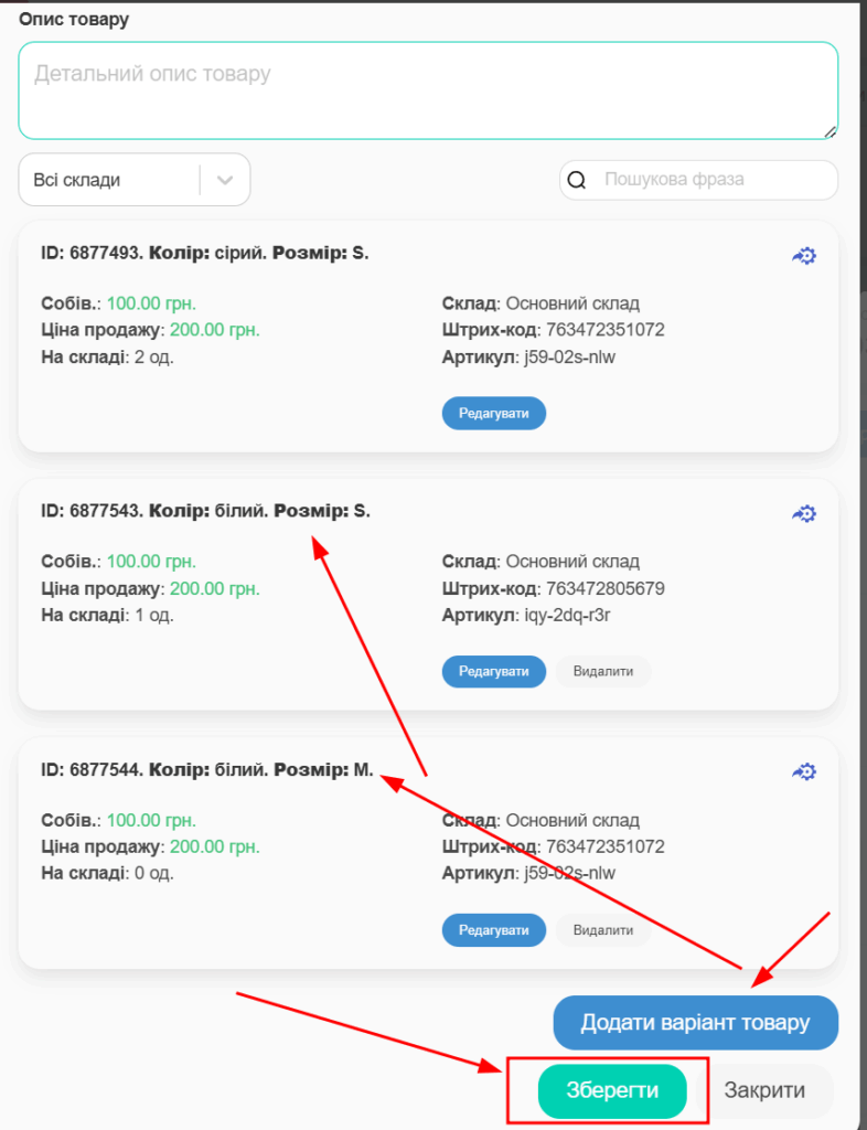 Створіть стільки необхідних варіантів вашого товару (через кнопку “Додати варіант товару”), скільки вам потрібно, після чого виберіть “Зберегти”