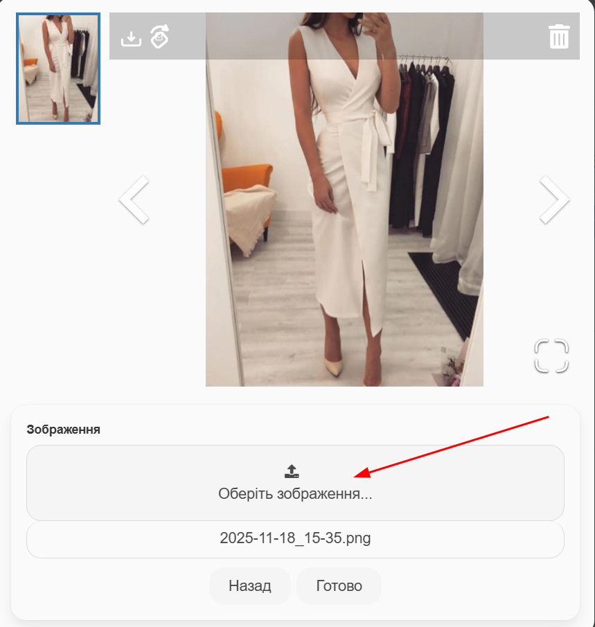 Далі відкриється поле для завантаження зображень товару. Можна опублікувати одне або кілька фото або ж пропустити цю опцію, натиснувши “Готово”